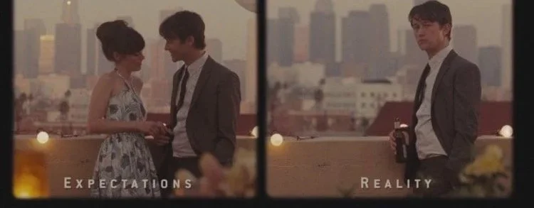 Tom’s downfall lies in his refusal to see Summer as a person with her own agency. Instead, he reduces her into the figurative missing puzzle piece that would give his life meaning. This act of idealisation is made most explicit via the ‘Expectation vs. Reality’ split-screen sequence where Webb visually externalises Tom’s delusion.